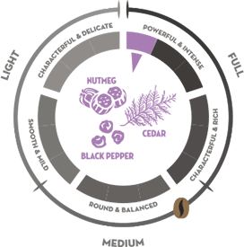 Intensywna kawa z wyraźnymi nutami cedru i gałki muszkatołowej, wzbogacona akcentem czarnego pieprzu. To subtelna kawa o niezwykle bogatej palecie smakowej. Idealna dla miłośników naprawdę pełnego cappuccino, espresso lub ristretto.